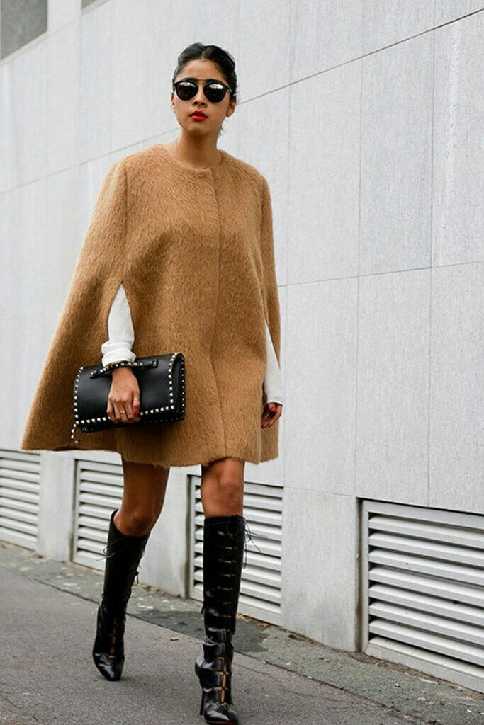 Las capas son amplias, evita el exceso de volumen en la zona de las piernas. Podrían crear el efecto visual de ensanchar tu cuerpo y disminuir tu altura. Así que lo mejor es combinarlas con pantalones pitillo o leggins. Si las usas con vestidos cortos o faldas cortas, acompáñalas de medias en tonos opacos y con botas de caña alta.